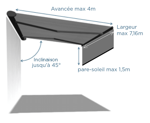 - Protection solaire XL : Dimensions allant jusqu’à 7,16 m de largeur et 4 m d’avancée, idéal pour des zones d’ombre étendues sur grandes terrasses ou espaces commerciaux.